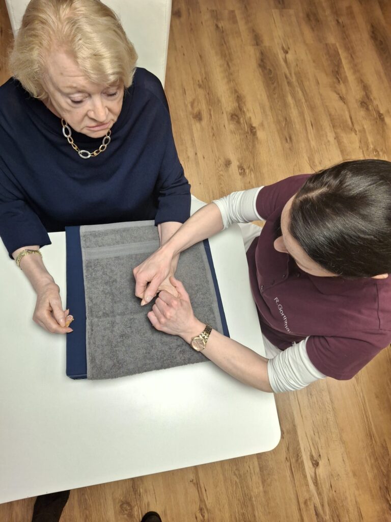 - Kraft- und Koordinationstraining: Aufbau von Greifkraft und Feinmotorik, Training alltagsrelevanter Bewegungen, arbeitsbezogenes Training